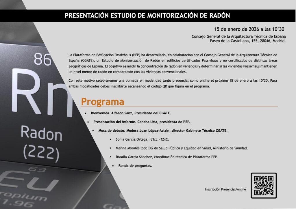 El próximo 15 de enero de 2026, tendrá lugar la presentación del Informe de Monitorización de Radón, un estudio elaborado por la Plataforma de Edificación Passivhaus (PEP) en colaboración con el CGATE.